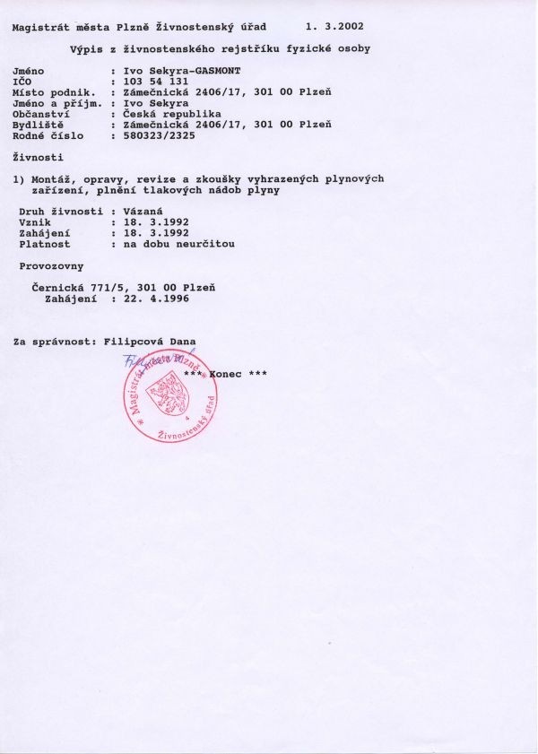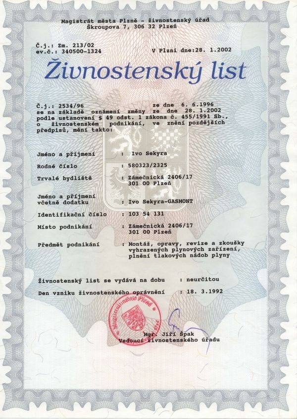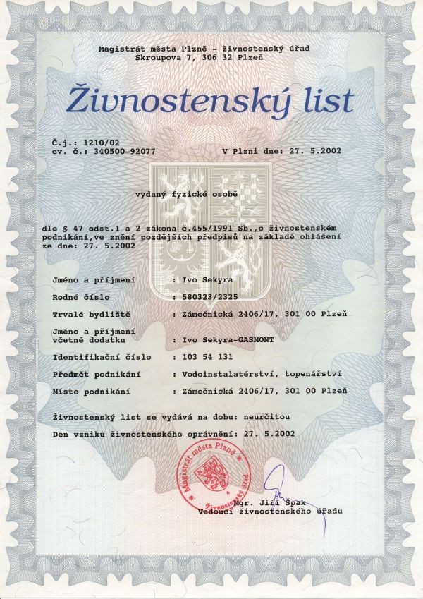 Živnostenský list voda Výpis z živn.rejstříku Osvědčení k montáži EUROGAS
