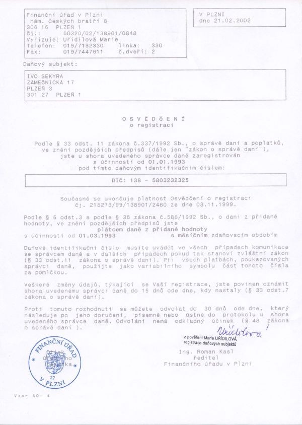 Osvědčení o registraci DPH Osvědčení TIČR- revize, zkoušky 1 Osvědčení TIČR- revize, zkoušky 2